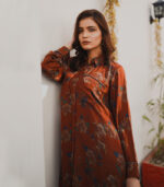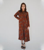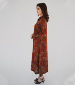 Embrace earthy elegance with this rust brown floral Silk shirt, adorned with subtle blue and beige blooms. Its flowing cut and classic collar make it a versatile pick for both casual outings and seasonal gatherings.