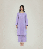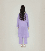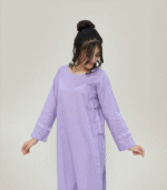 Refresh your wardrobe with this soft and graceful lavender co-ord set, a perfect balance of simplicity and charm. The long straight shirt features a round neckline and full sleeves, detailed with delicate lace accents on the cuffs. The matching straight trousers are finished with lace trims at the hem, adding a touch of sophistication. Ideal for daytime outings, casual gatherings, or semi-formal occasions, this set offers both comfort and elegance.