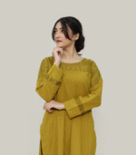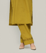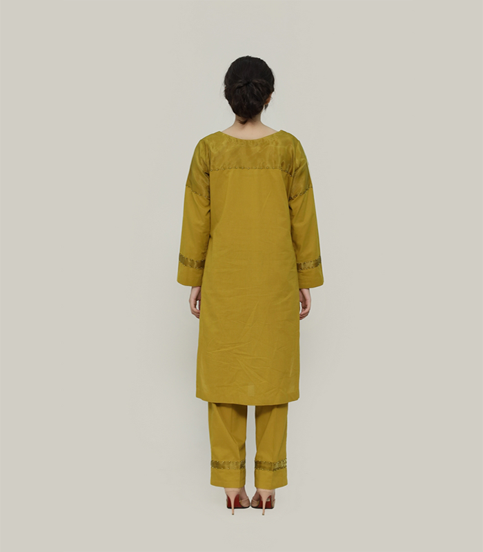 Graceful and commanding in its simplicity, The Silent Leader co-ord set brings a refined elegance to your wardrobe. The long straight shirt features a soft boat neckline framed with an organza panel embellished with delicate beadwork, lending a graceful finish. A wide organza-beaded accent across the upper front adds a sophisticated design element, while the sleeves are detailed with matching organza beaded patches, including a sleek touch at the cuffs. The straight trousers mirror the same organza-beaded design at the hem, completing the ensemble with perfect harmony. Ideal for semi-formal gatherings, chic daywear, or elegant evening looks.