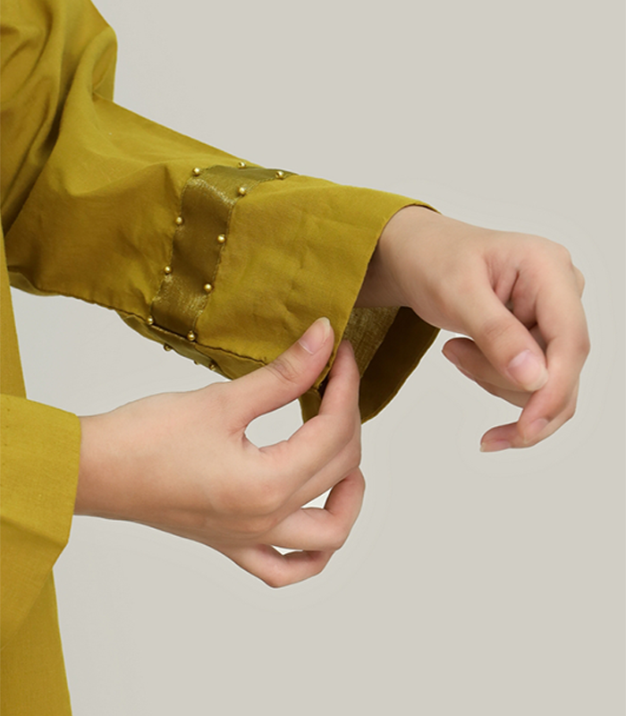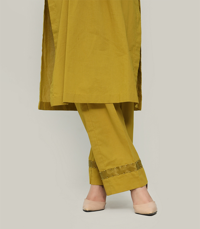 Design Accents: Organza beaded detailing on neckline, upper shirt, sleeves, and trouser hem